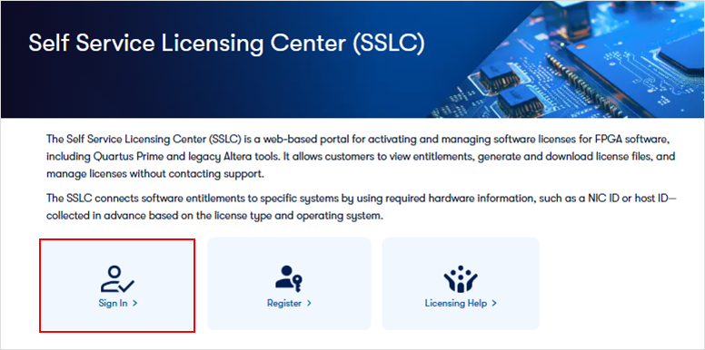 ・ ライセンスセンターに初めてサインインするお客様は、Altera アカウントを登録した上で Self Service Licensing Center への利用登録 をおこなってください。