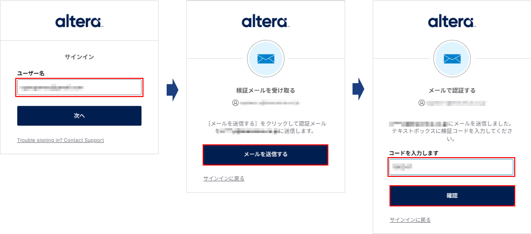 ユーザー名を入力すると、登録済みのメールアドレス宛に認証コードが送信されます。フォームにコードを入力して [確認] ボタンを押下してください。