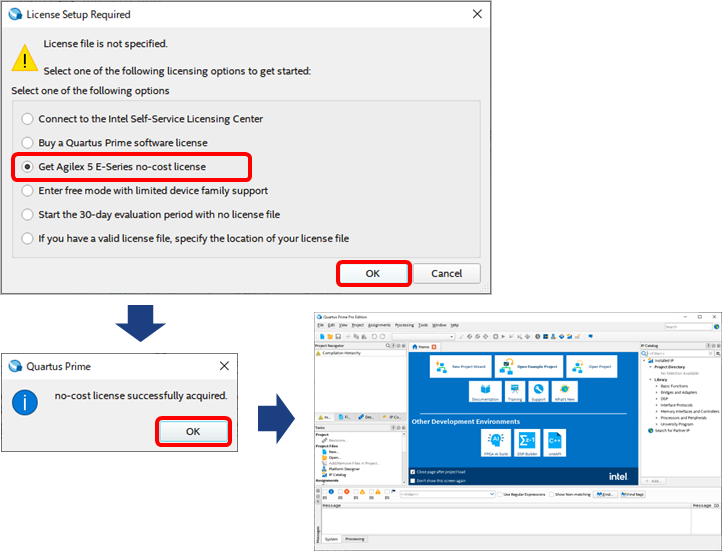下図の License Setup Required が表示された場合は、"Get-Agilex 5-E Series no-cost license" を選択し OK ボタンをクリックしてください。