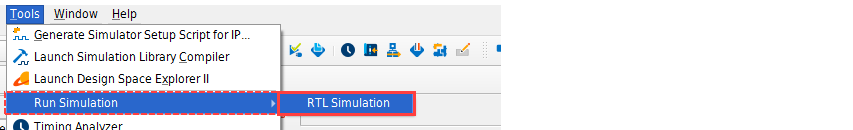 ② Tools メニュー > Run Simulation > RTL Simulation を選択し実行します。