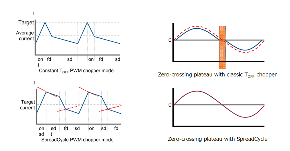 モーターの静音性に貢献する技術が、電流を最適化する「SpreadCycle™」と電圧を最適化する「StealthChop™」です。