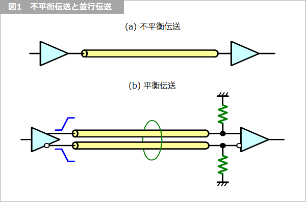 図1 は、グラウンドを基準に送る不平衡伝送(Unbalanced Transmission)と、2本の線路に互いに極性の異なる信号を与えてその差をとる平衡伝送(Balanced Transmission)とを示します。