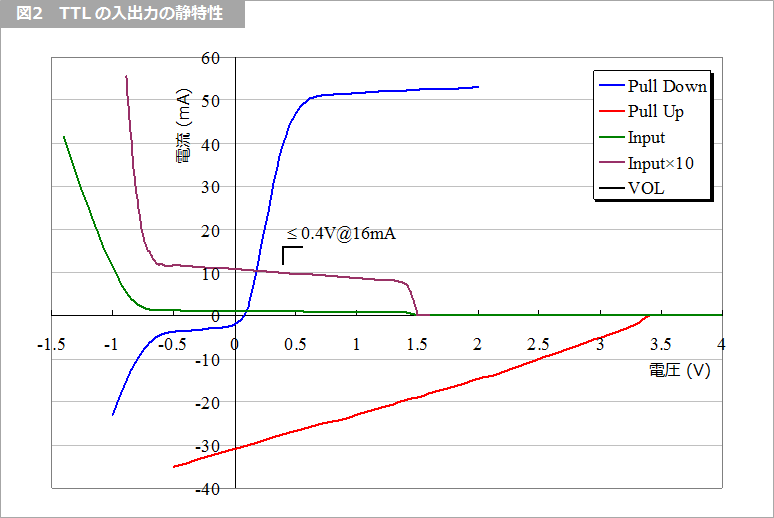 図2 は TTL の入出力の静特性です。電流は、出力に流れ込む向きを正としています。TTL の Low 側の入力電流は、-1.6 mA です。少しややこしいのですが、負号はデバイスから流れ出ることを意味します。図2 は前段の出力と次段の入力とが接続された例なので、入力電流は正、すなわち、入力から流れ出て、前段の出力に流れ込むことを意味します。Low 側の出力の規定は負荷を 10個、すなわち、16 mA 流し込んだ状態で、0.4 V 以下です。