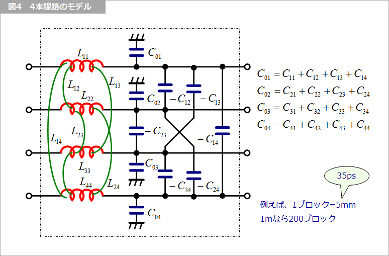 解析は、図4 の等価回路を必要ブロック繰り返して縦続接続して SPICE などの解析ソフトを用いて行います。