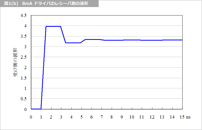 図1(a) は、24 mA ドライバを用いたときのレシーバにおける波形で、図1(b) は 8 mA ドライバのときの波形です。どちらがよい設計かは (b) だとお分かりだと思います。ダンピング抵抗は (a) の波形を (b) のようにするために用いる抵抗で、最適値があります。詳しくは、『フレッシャーズ:ダンピング抵抗~その2』で解説します。