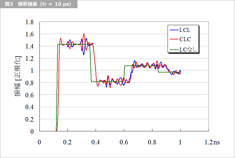 図1 の (a)、(b) どちらの等価回路でも、立ち上がりにオーバシュートが現れるのは共通の特徴ですが、ドライバ側の線路と LC 回路との間の反射と、LC 回路の通過、および遠端の線路との反射などが重なって、等価回路の (a) と (b) とでは、凸凹の現れ方が逆になっています。この凸凹が逆になっているのは等価回路から考えると当然ですが、実際にはあまり重要ではありません。また、この解析は影響を誇張したもので、図4 には信号の立ち上がりを、100 ps (これでもかなり速い)としたときの解析結果を示します。通常の用途では、ほとんど影響は無視されると考えます。