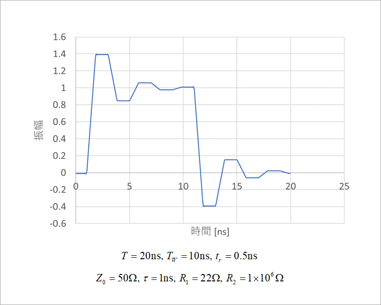 特性インピーダンス Z0、線路長(遅延時間)τ、ドライバの出力抵抗R1、レシーバの終端抵抗R2を与えて、J列に伝達関数と信号源の積を計算しています。