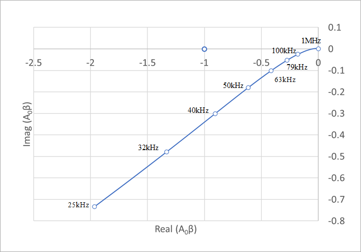 図29(a)は、1Hzから10MHzまで矢印の方向に描いています。ナイキスト判別で必要なのは、位相が-180°前後のデータです。同図(b)は、この必要な範囲(33kHzから10MHz)だけを抜き出したものです。この曲線が横軸と交わる点は振幅の虚数部がゼロ、すなわち位相が-180°となる点です。これは、図20(b)の56.5kHzに相当します。不安定の条件は、この点における利得が0dBすなわち1以上です。