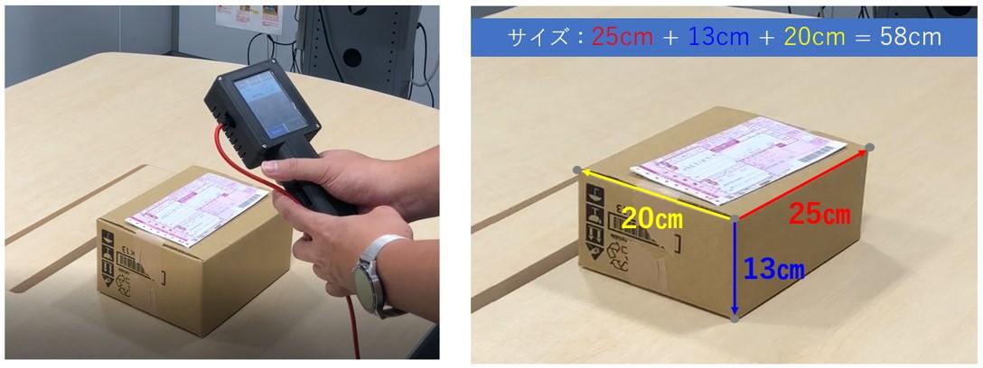外形サイズの計測をする場合、端末を荷物にかざしシャッターボタンを押すと、ToFセンサーによって瞬時に計測します。荷受けする人は、LCDモニターで、計測結果のサイズを確認できます。発着地と外形サイズが確定したら、配送料を自動計算して画面に表示します。取得したデータはWi-Fi経由でPC等に転送して連携できます。