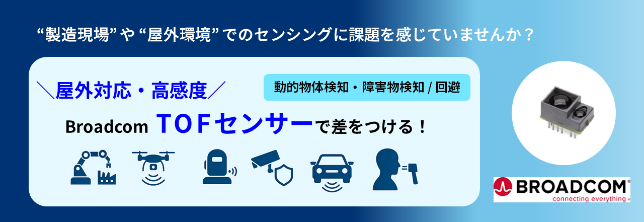 Broadcom社のTOF(Time-of-Flight)センサーは、物体検知や距離測定に優れた光学センサーであり、屋内外問わず高精度なセンシングが可能です。