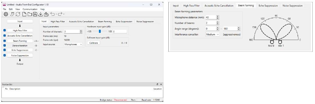 左図:パラメータおよび機能ブロック設定 右図:Beamforming 設定