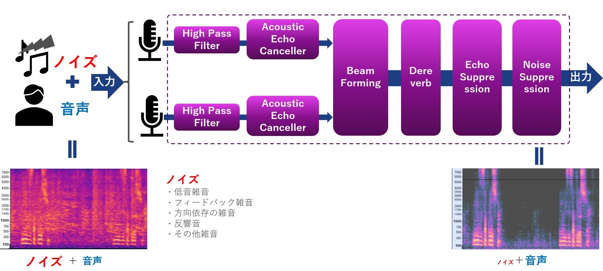 音声入力デバイスや音声認識アプリケーションにおいて、マイクから取得した音声をよりクリアに、認識しやすい状態へと整えるための前処理を担います。