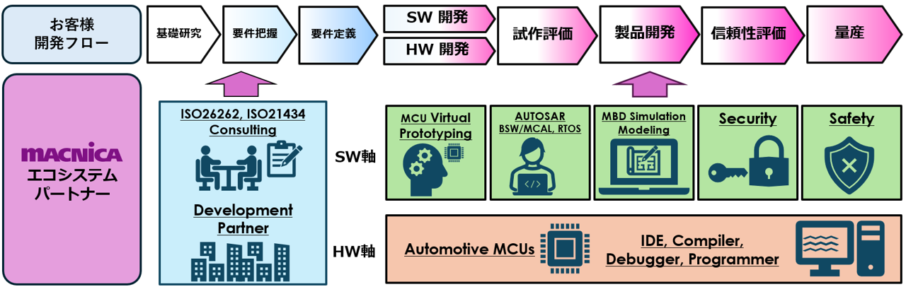マクニカでは、インフィニオン社の車載マイコンと高い親和性を持つエコシステムパートナーを軸に連携し、開発ライフサイクル全体を包括的に支援するソリューションをご提供しています。