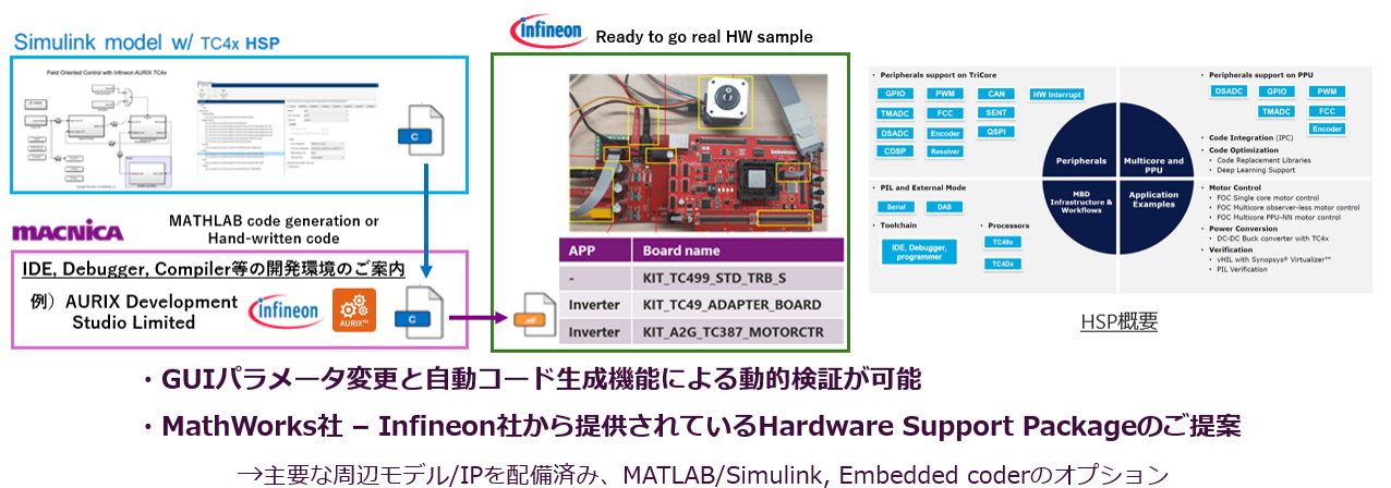 MathWorks社ツールを採用されることで利用可能な、AURIX™向けHardware Support Package(HSP)を活用することで、簡単に制御モデルを同環境で構築することが可能です。