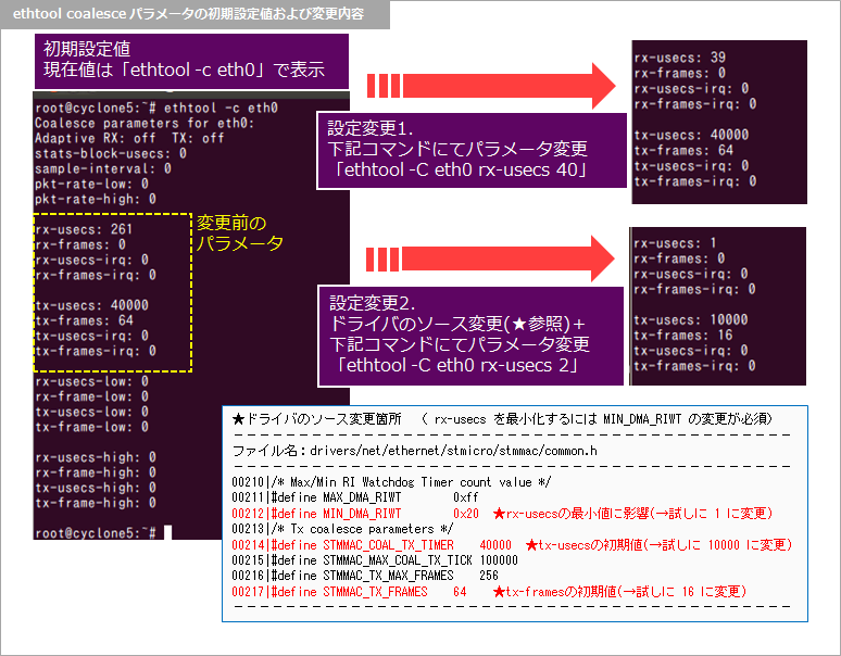 この記事の実験でも上記のパラメータを編集しています。初期設定値(変更前)の状態に加えて、2パターンのパラメータ変更を加えた環境(設定変更1、設定変更2)で実験を行いました。その際、設定変更1、設定変更2 のパラメータ変更は 2台の評価ボードの両方にそれぞれ同じ設定を行っています。なお、rx-usecs の設定値には下限値が設けられているようでしたが、ドライバのソースコードを変更することでより小さな値をセットすることが可能でした。(設定変更2で実施)