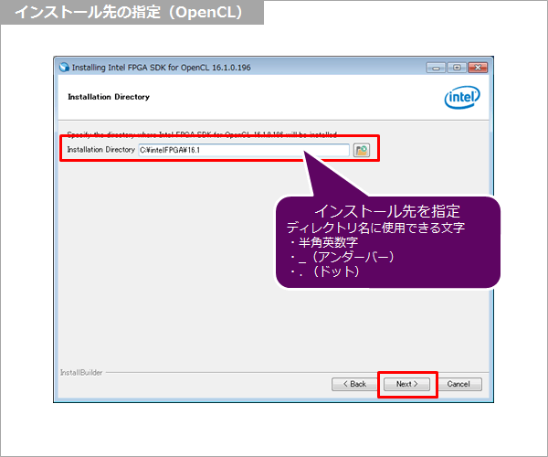 必要なファイルが揃ったら、いよいよインストールです。インテル® FPGA SDK for OpenCL™ の実行ファイルをダブルクリックすると、ウィザードが起動します。指示に従って、インストールを進めていきます。