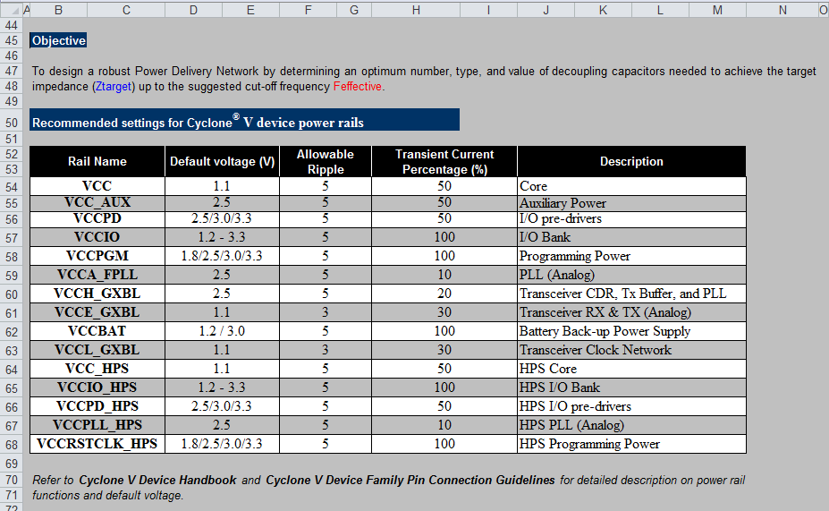 ポイント2とは別に、急激な電圧変動においては、別の変動範囲が規定されております。 デバイスによって値が異なるため、PDNツール の Introductionシート の 各デバイスの Allowable Ripple を確認してください。