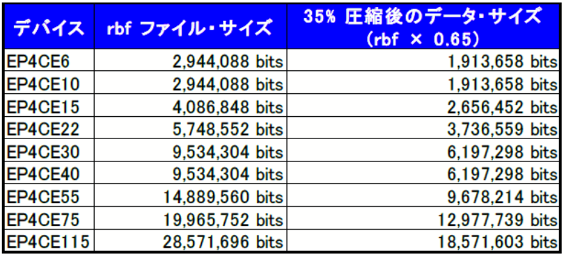 尚、 Cyclone IV E デバイスの rbf に 35% 圧縮率を適用した一覧表がこちらです。