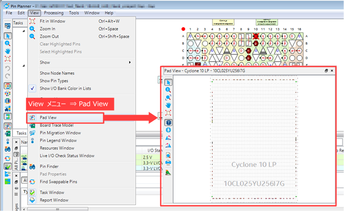Quartus Prime の Pin Planner 上から、View メニュー > Pad View により表示します。(パッケージ・ビュー上で右クリック > Pad View でも OK!)