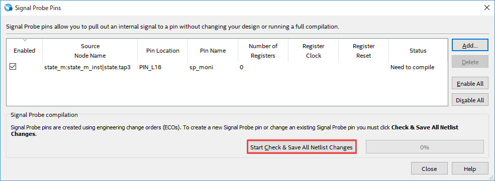 もし、Start Signal Probe Compilation が非アクティブで選択できない場合は、Tools メニュー > Signal Probe Pin を起動し、