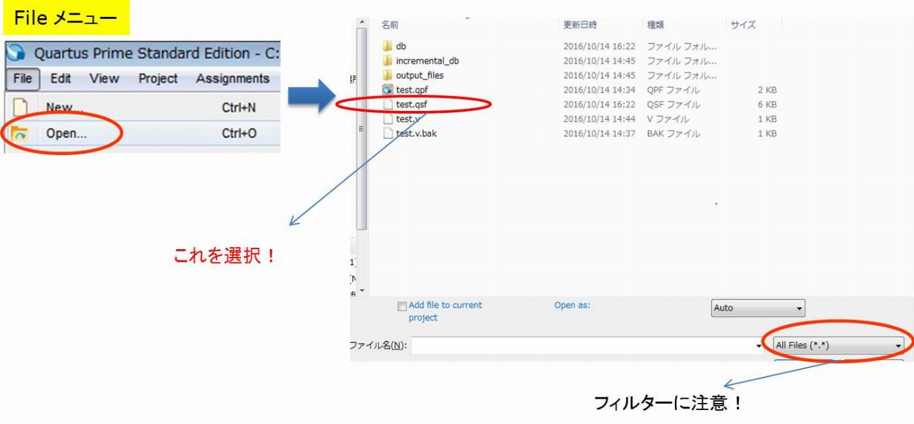 Quartus 上の「File メニュー」 ⇒ 「Open」⇒ 「.qsf ファイルを選択」