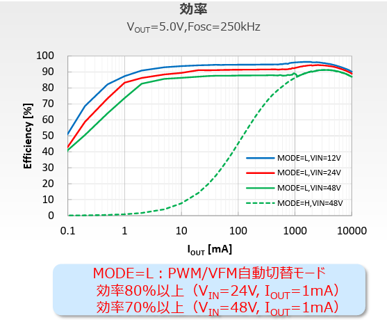 PWM/VFM自動切替モードで軽負荷時にはVFM制御となり、軽負荷時でも高効率化を実現。