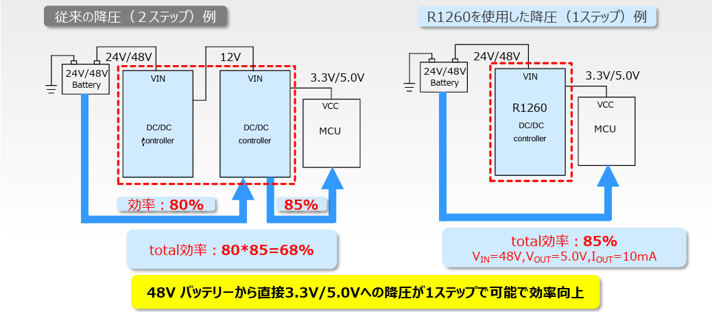 「R1260」は48Vバッテリーから直接3.3V/5.0Vへ降圧可能な高効率ICです。
