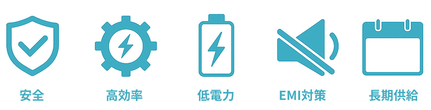 高効率・低EMI・柔軟な設計性で、AGV、監視カメラ、通信機器、データセンター機器などに最適です。 |
