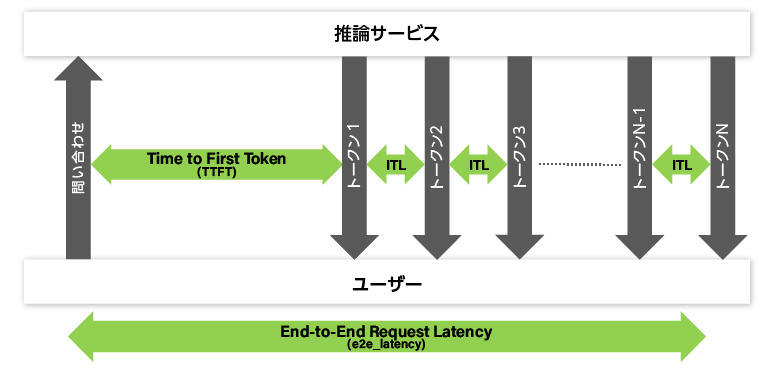 End-to-End Request Latency(e2e_latency)は、ユーザーがLLMへ問い合わせを行ってから、LLMからすべての出力トークンが返るまでの時間です。e2e_latencyには、LLMサーバーのキューイング機構やバッチ編成機構に関わる時間、ネットワーク遅延が含まれることに注意してください。