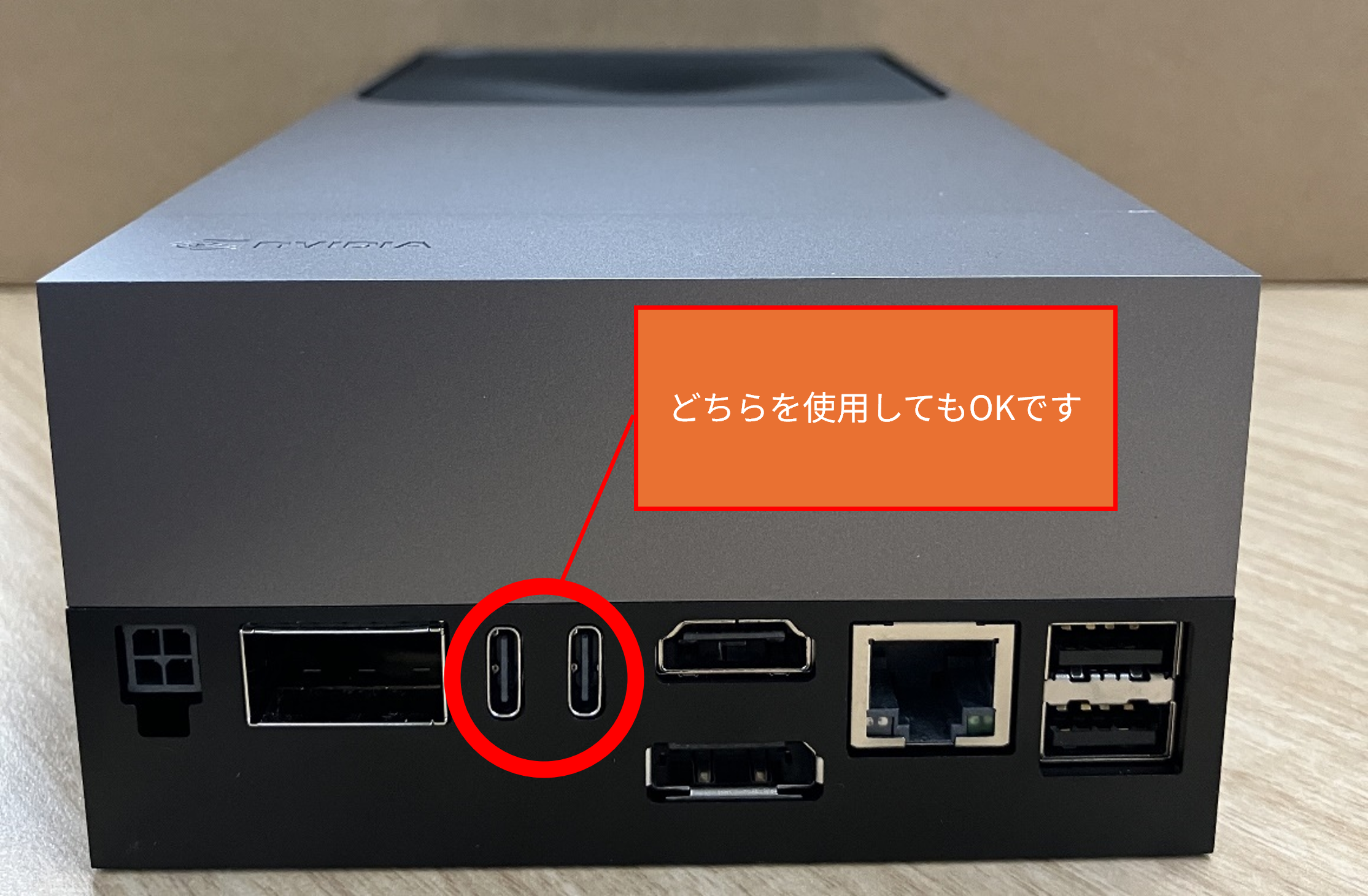- Jetson AGX Thor 開発者キット側面のUSB-Cポート(蓋の中のデバッグ用USB-Cポートではない)とホストUbuntu PCを繋げる