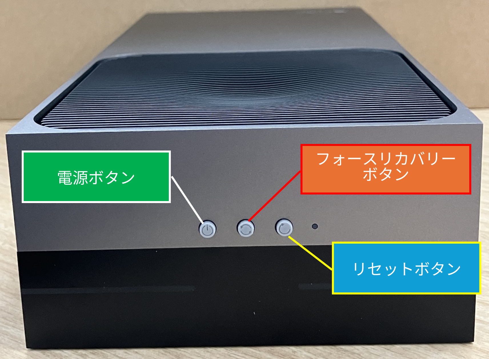 - 中央のフォースリカバリーボタンを押しながら電源コネクタを接続。電源が入って数秒経ったらフォースリカバリーボタンを離す。