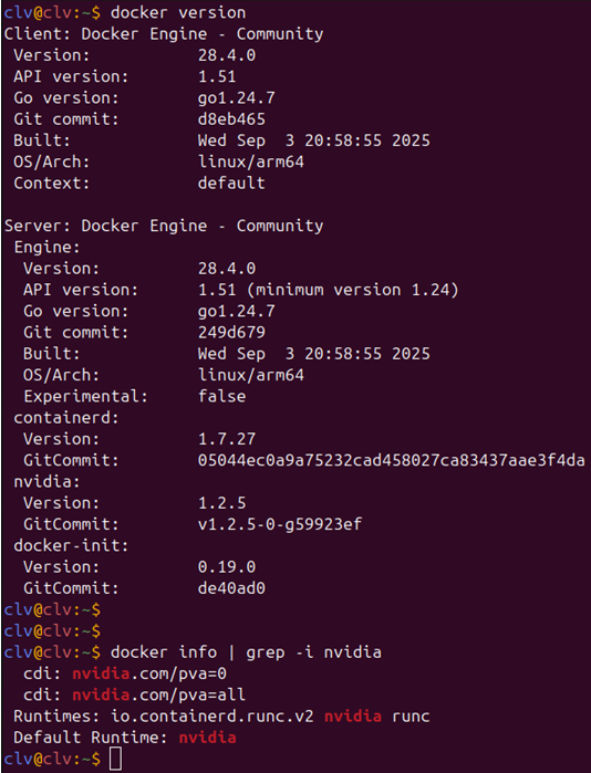 こちらのガイドに従っていただくことで、インストールからコンテナの動作テストが行えます(Docker Setup — Jetson AGX Thor Developer Kit - User Guide)