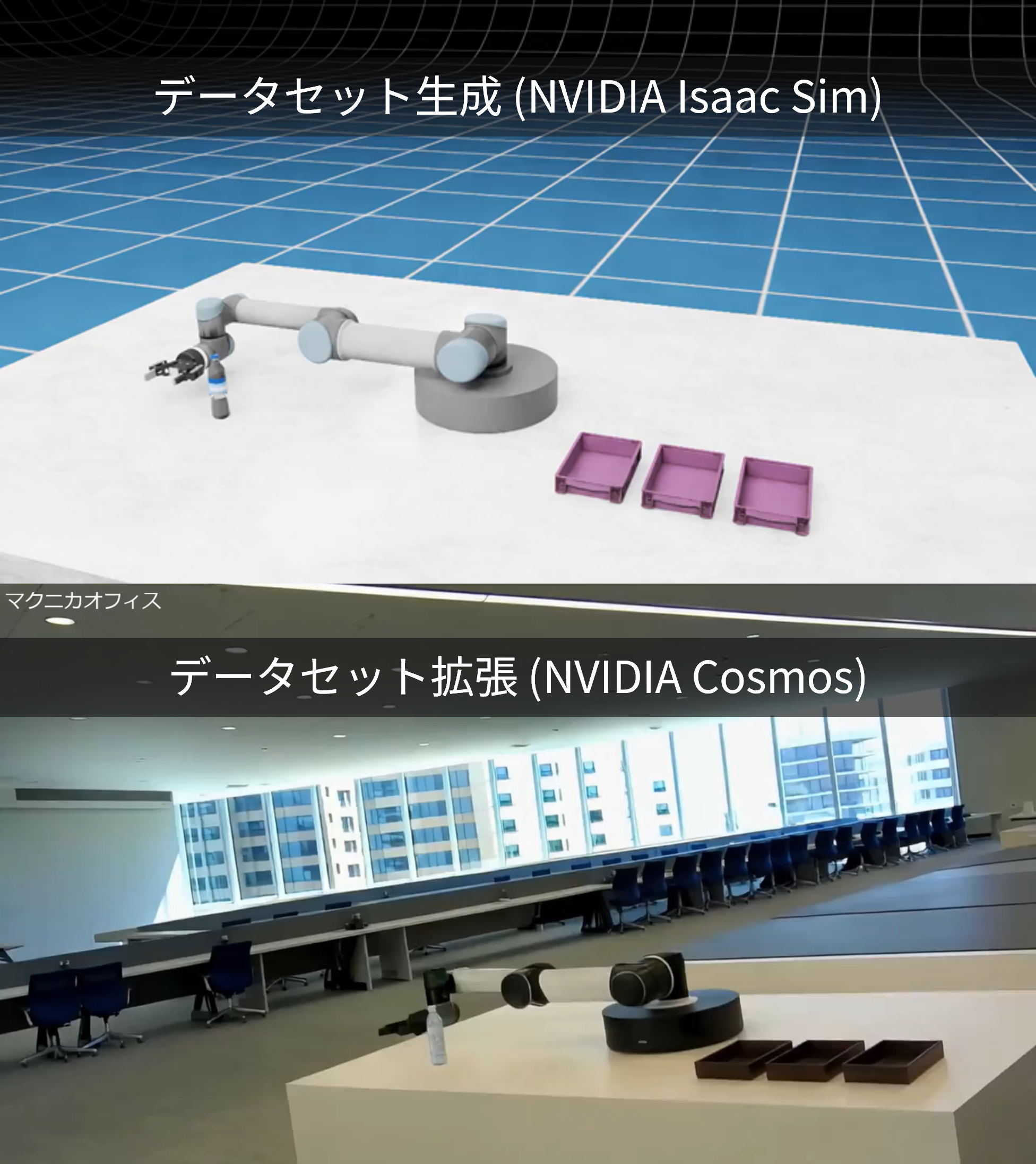 このようにNVIDIA Isaac Sim上でフォトリアルなデータセットの生成だけでなく、そのデータをもとにさらに、さまざまなシチュエーションに富んだ形でのデータ拡張をNVIDIA Cosmosで実現できます。したがって、実際に実機ロボットを使用しなくても仮想空間上でデータ生成・拡張の工数を最小限にします。
