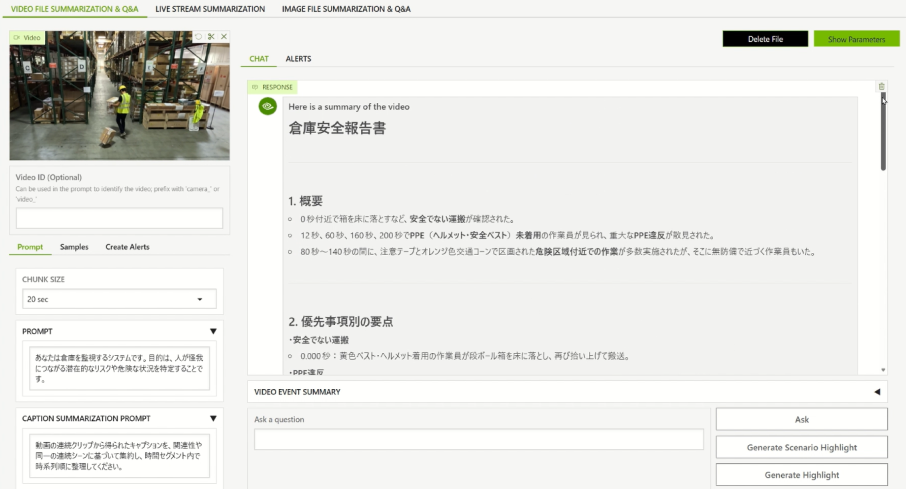 こちらは、NVIDIA社が提供するVSSエージェントである、”NVIDIA AI Blueprint for Video Search and Summarization”(以下、VSS)を用いています。
