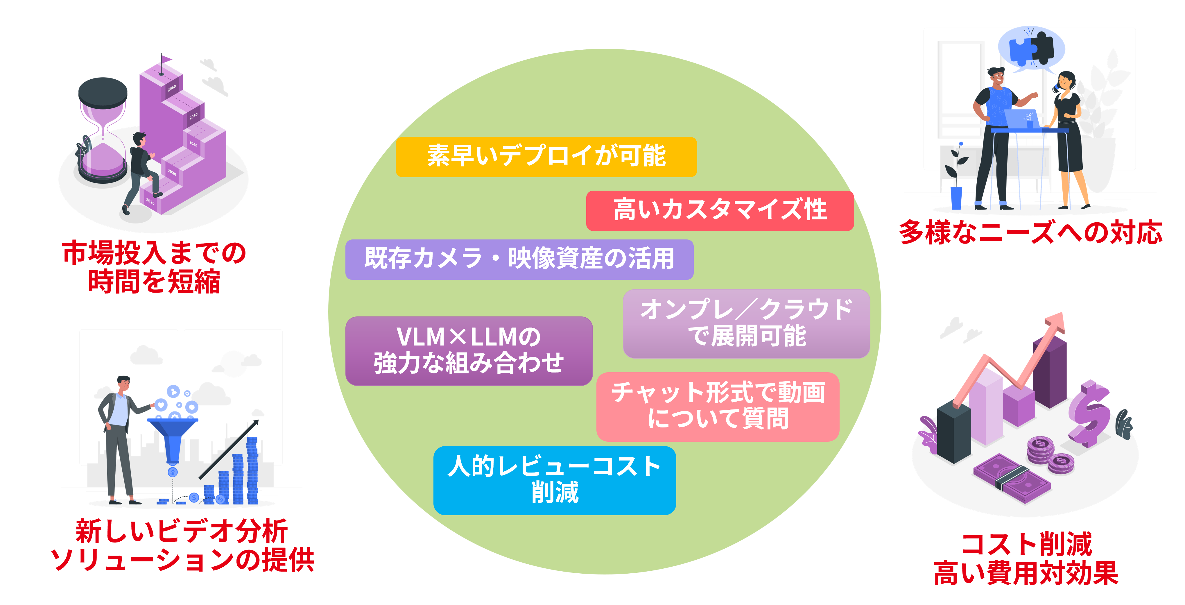 新しいソリューションの提供:VLM×LLMの強力な組み合わせにより、新しいビデオ分析ソリューションの提供に貢献します。