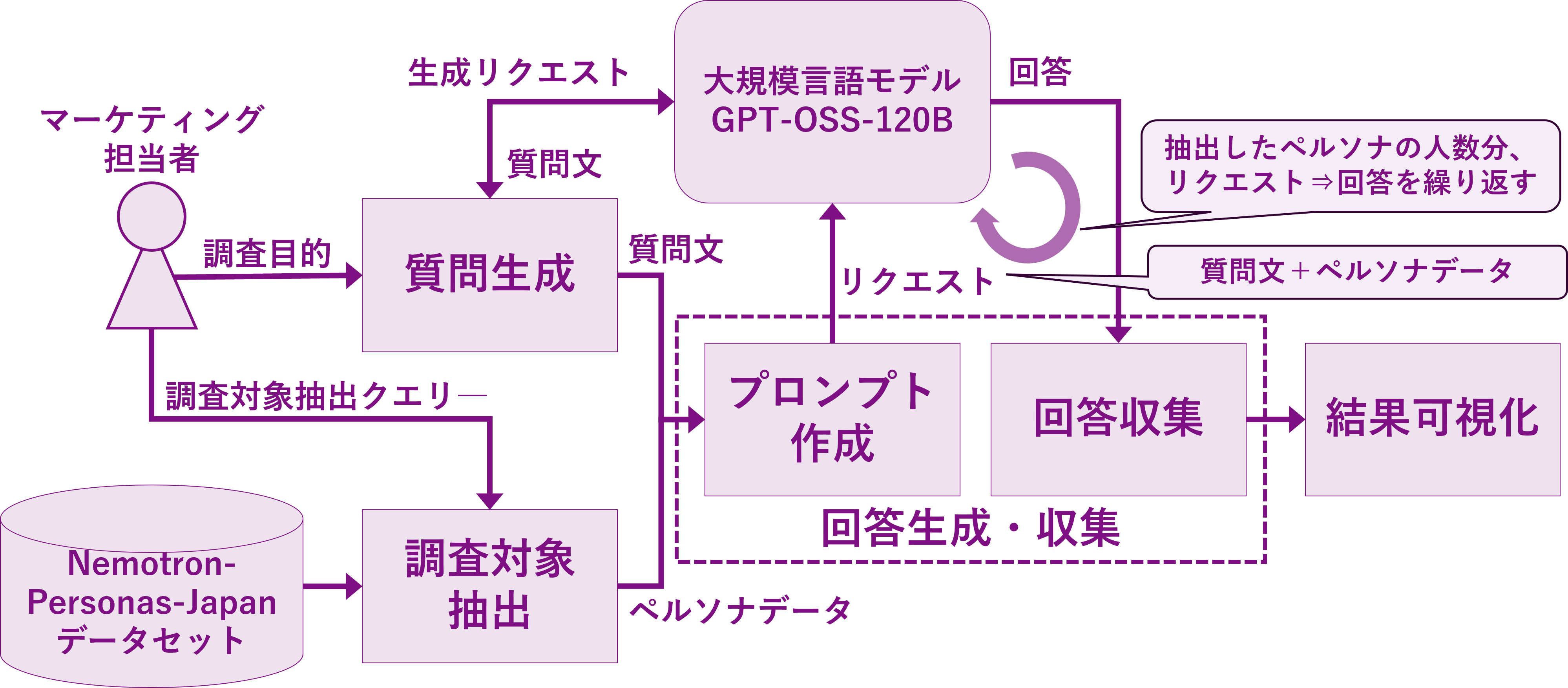 - 日本の人口統計、職業、生活背景を反映したペルソナの合成データセットであるNemotron-Personas-Japan(*1)から抽出したペルソナを基に、LLMがアンケート調査に回答するプロセスを示す。