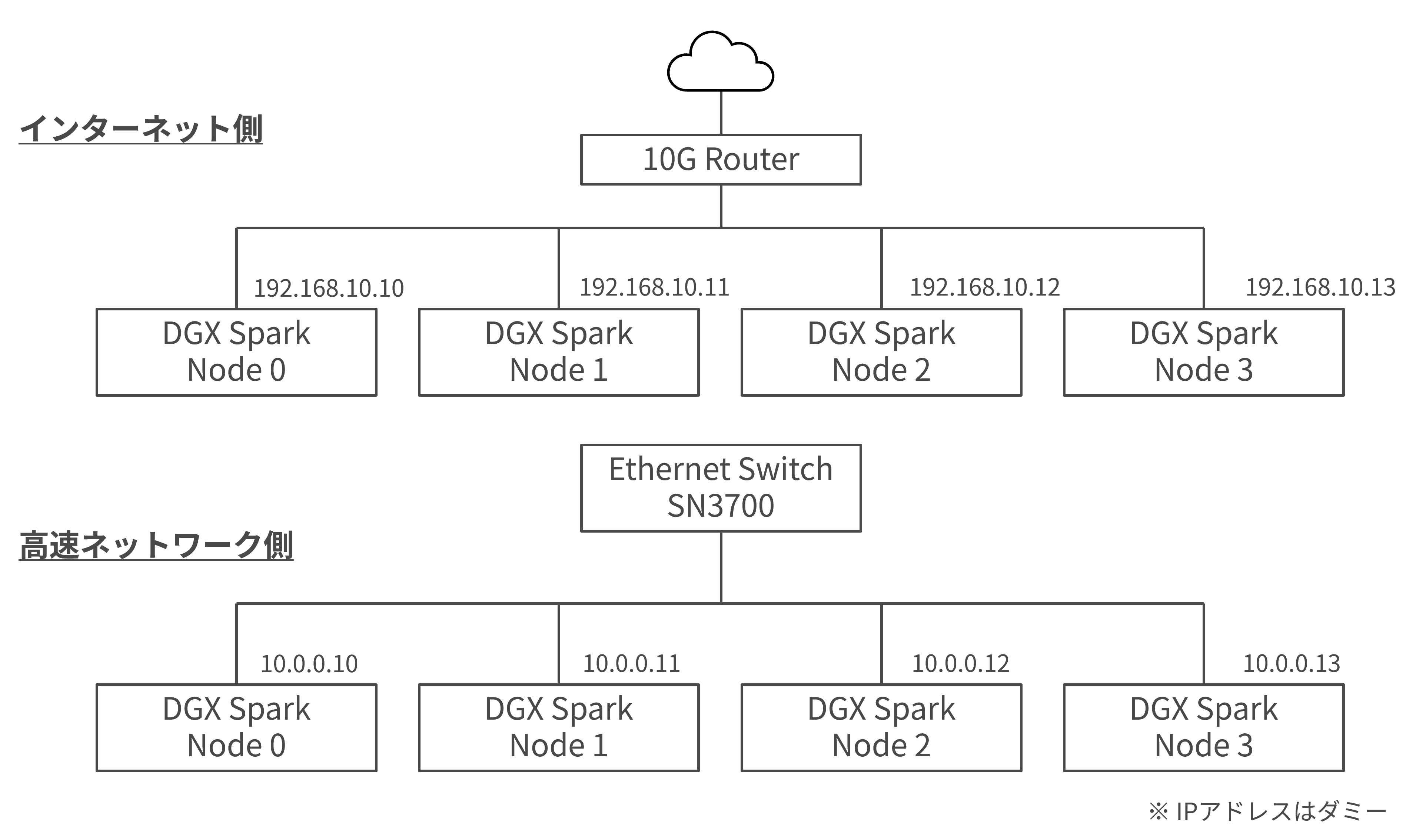 まずはGPUクラスターの準備、つまり高速ネットワークで各Sparkが接続されている環境を作る必要があります。今回はDGX Spark内のパッケージ更新も必要だったため、インターネット側・高速ネットワーク側の両方のネットワークを準備しました。