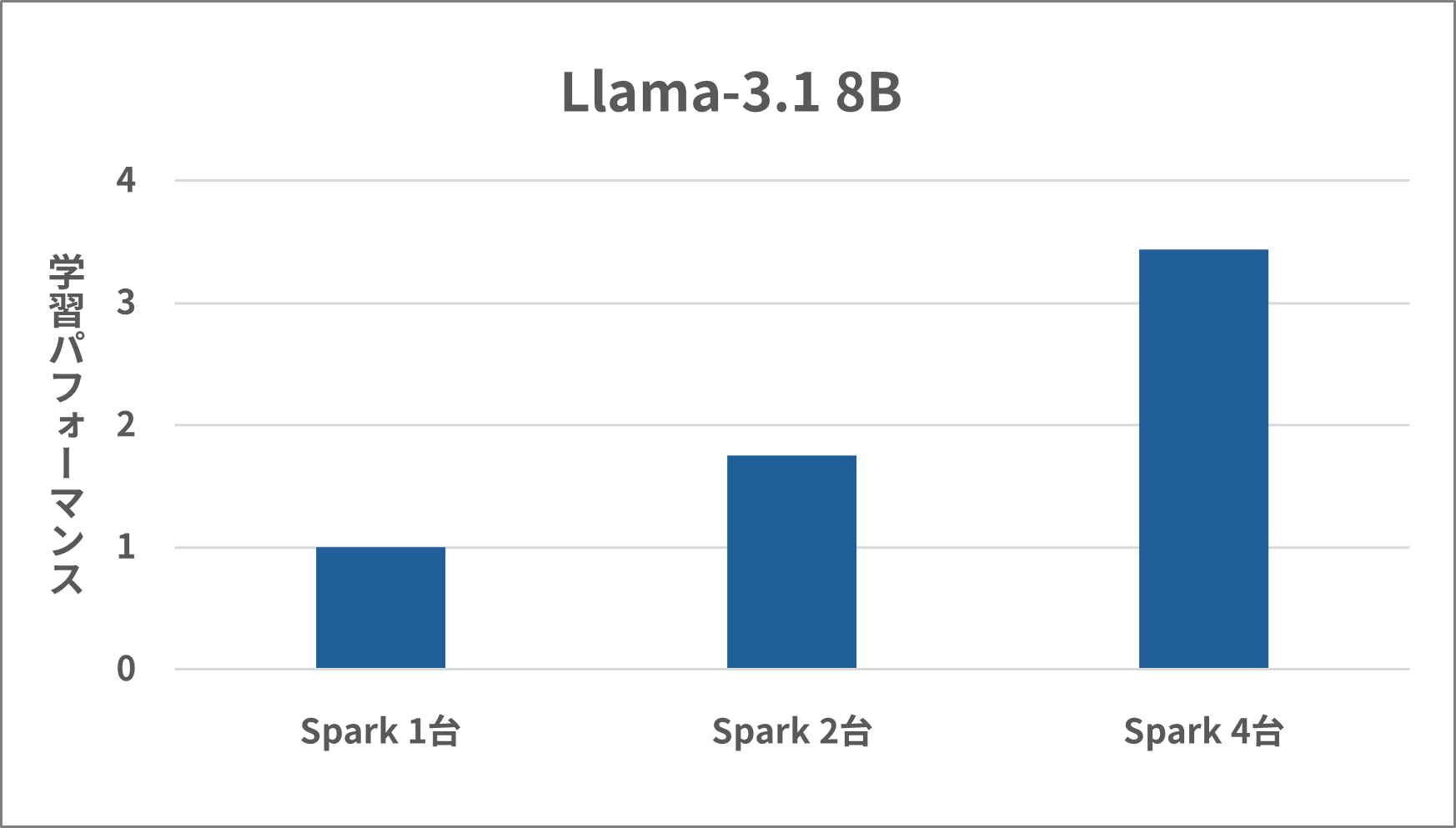 今回は、DGX SparkとSN3700でGPUクラスターを構築し、Spark 1台、2台、4台構成での学習時間を比較しました。