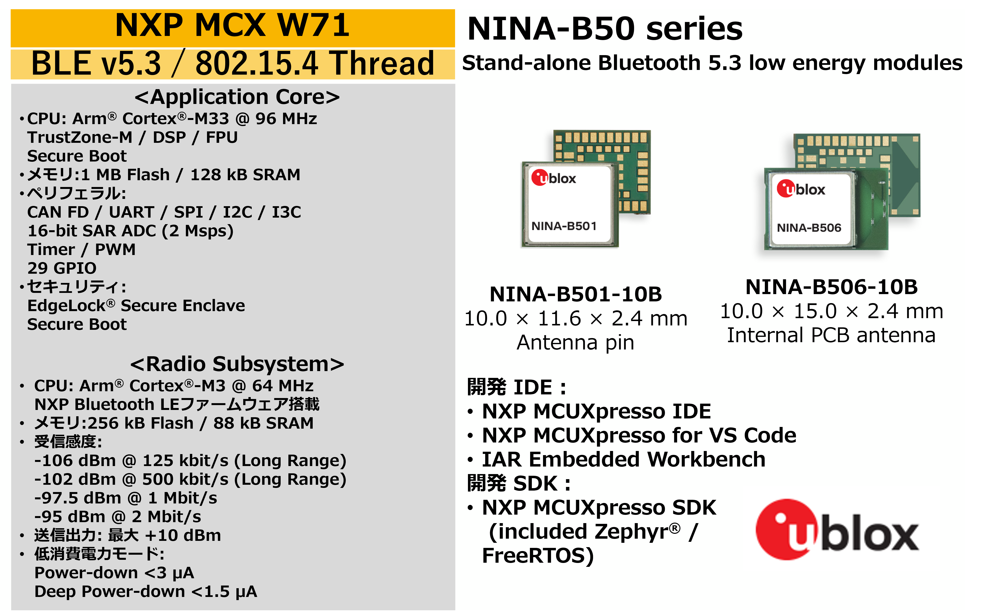 NXP® MCX W71 Bluetooth 5.3 BLE マイコン搭載 u-blox NINA-B50 series