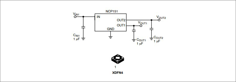 “NCP151” は、出力電流300mAのデュアル出力の小型パッケージのリニアレギュレーターです。