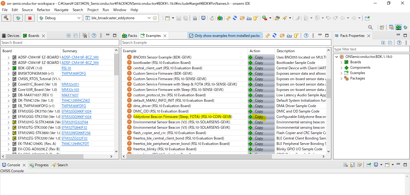 3. Eddystone Beacon Firmware(Sleep,FOTA)(RSL10-COIN-GEVB)というサンプルプロジェクトを選択し、コピーボタンをクリックして、ワークスペースにインポートします。(図1参照)