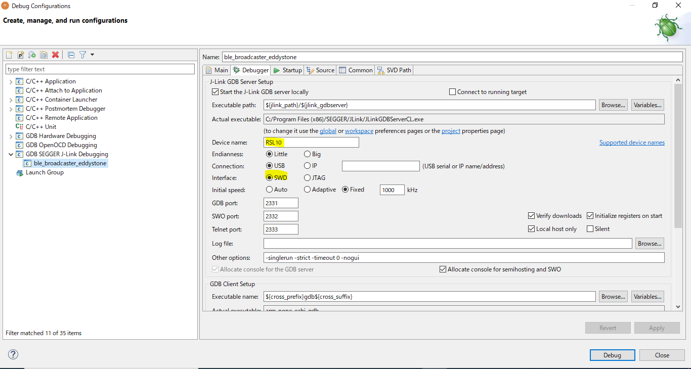 3. Debuggerタブに移動し、「デバイス名」欄に「RSL10」と入力します。ターゲット・インターフェースにSWDが選択されていることを確認してください。(図8参照)