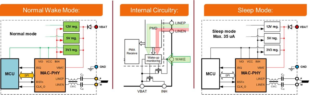 MAC‑PHY が INH を使って外部電源を自律制御し、スリープ時は 35uA 以下で LIN/Wake 入力だけを監視、イベント発生時に即座にフル電源復帰する低消費電力アーキテクチャーです。