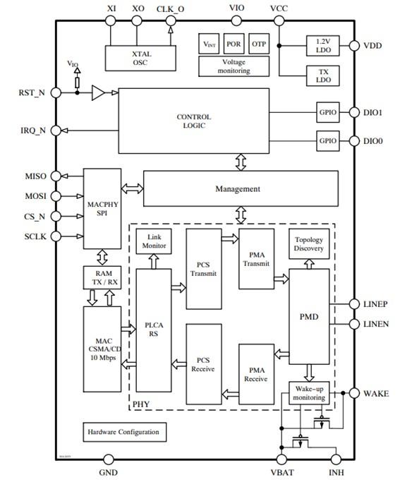 T30HM1TS2500は、IEEE 802.3cg 準拠のMAC/PHYを内蔵したイーサネット・トランシーバーです。PLCA動作時の実効スループットは最大約 9.5Mbpsです。