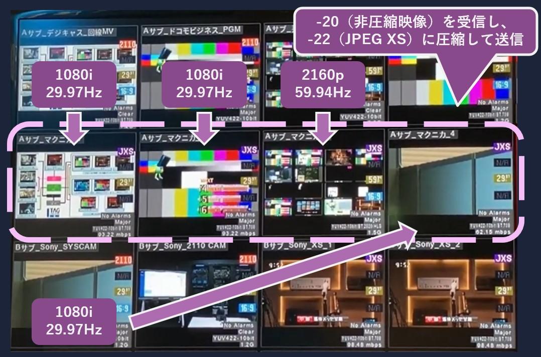 そこで、通信帯域幅を大幅に削減できるJPEG XSによる映像圧縮技術を利用し、ST 2110 -22による映像伝送を試みました。