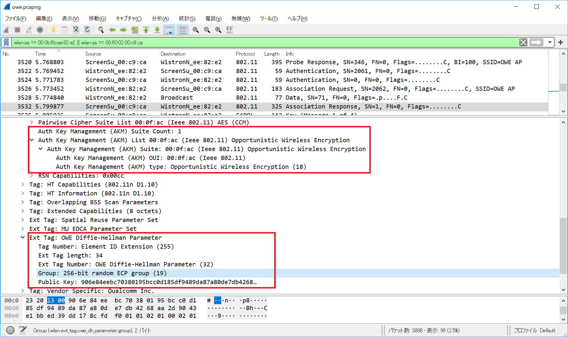 OWEのAuthentication frameではAuthentication algorithmに”Open System”を指定します。Authentication frameのやり取りが完了すると、Association frameのAKMでOWEを指定しお互いのpublicキーを交換します。