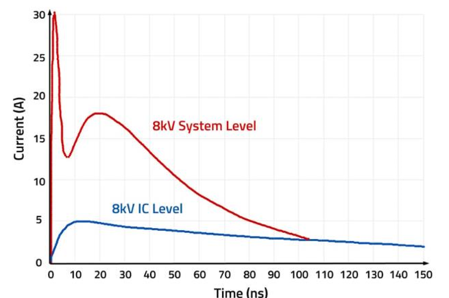 さらに、IECの波形では2つ目の電流ピークが約18A前後に達し、HBMで見られるピーク値よりも大幅に大きくなります。総合的に見ると、IEC 61000-4-2のパルスは、HBMに比べて立ち上がりの速さ・電流値・放出されるエネルギー量のすべてが大きく、ICに与える負荷は格段に厳しいものとなります。そのため、システム全体をESDから保護するには、高エネルギーの急峻なパルスを低インピーダンスで受け止められるESD保護素子を組み込むことが不可欠になります。