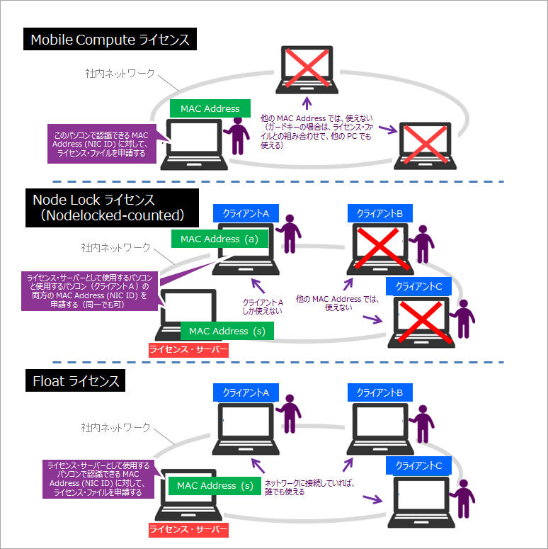 Node Lock (Nodelocked-counted) および Float ライセンスは、ライセンス・サーバーにライセンス設定をおこない、各クライアント PC からネットワークを介してライセンスを認識します。