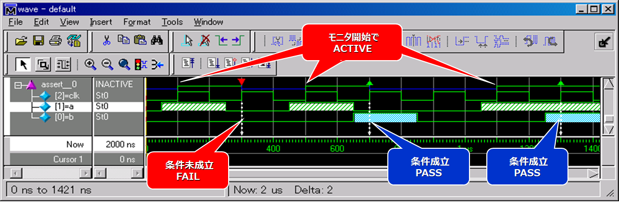 Wave ウィンドウには波形結果が表示され、アサーションの PASS / FAIL が表示されます。