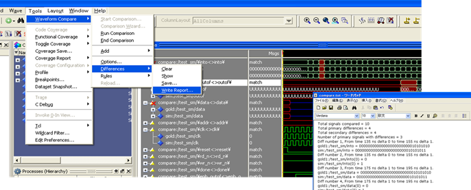 例えば、バグ FIX などによる回路変更後と変更前のシミュレーション結果を比較し、修正による動作の影響を確認することができます。波形比較機能では、シミュレーション結果の不一致箇所をハイライト表示させ、容易に判断することができるようになっています。